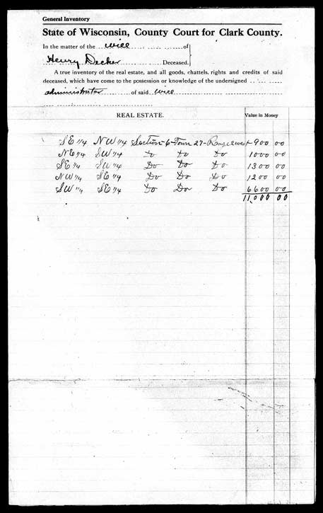 The other documents are the real estate appraisal for Henry Deckers farm in the Town of Warner, Clark County, Wisconsin, and his last will and testament that was written out be Fred Buker a couple of months before Henry died. After Fred wrote out the will and had it witnessed by George Buker and Gustave (Gus) Horn, they took it to Greenwood to have an attorney look it over and approve it. Fred Buker's testimoney is here.