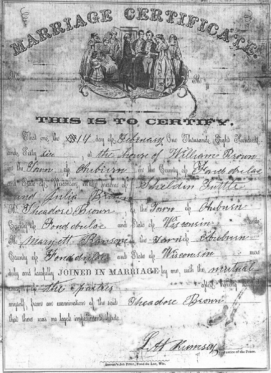Theodore Brown, Jr. was the youngest child of Theodore and Ruth (Collins) Brown. He was born August 5, 1836 in Sandusky, OH. In 1845, at the age of nine, he moved to Fond du Lac Co., WI. There, on February 14, 1865, he married Maryetta Ransom in Auburn, Fond du Lac, Wisconsin at the home of his older brother, William. His sister, Julia Brown, and his nephew, Sheldon Tuttle served as witnesses. Their first daughter, Alice, was born about a year and a half later (November 28, 1866). The next year and a half brought a second daughter, Luella (b. June 15, 1868) and a move to Michigan where they lived for seven years before relocating to Weston, Clark County, WI. There, they purchased property in section 24 near Cawley Creek, just 4 1/2 Miles North of Neillsville, WI on the right side road off Highway 73.