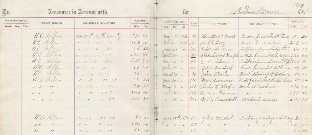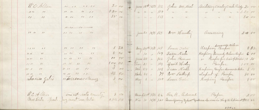 Names Mentioned Above: W. C. Allen, Loren Gates, Aurel MacBride, Hewett & Wood, Lacy, Gates & Mead, Blakeslee & ?, C. C. Palmer, John Marshall, John Chandler, Wm. Neverman, Charles ? Harper, Arnie Grossenor, ? C. Crandall, John McNeal, Wm. Huntley, Issac Nooke, Wm. Lathrop, Geo. H. Redmond, Mongomery Tylersand ? |