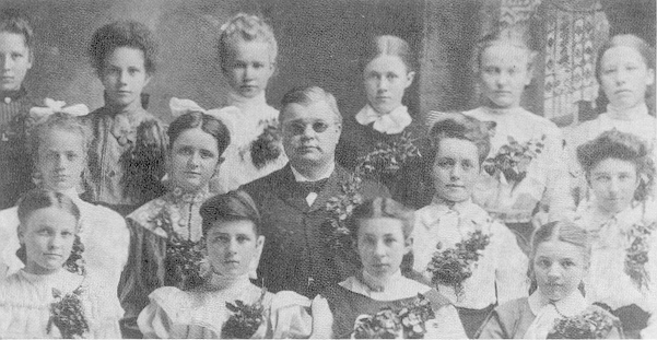 Fred Klemp, (blind man of Thorp, Wis.) and Group of young people, Methodist Church, Thorp, Wis. In the picture, Mr. Klemp, Ella Lindquist, Hazel Parkhill, Roomie LaBarge, Lettie Robelia, Anna McCutcheson, Grace Christian, Claude Parkhill, Alice Wiley, Lillie Welch, Ada Colby, Jennie Lindquist, Maude Elmendorf. Sunday school class, Mr. Klemp. teacher. Picture by Jim Clark. Compliments of Kate and Florence Hilbo, Thorp, Wis.
