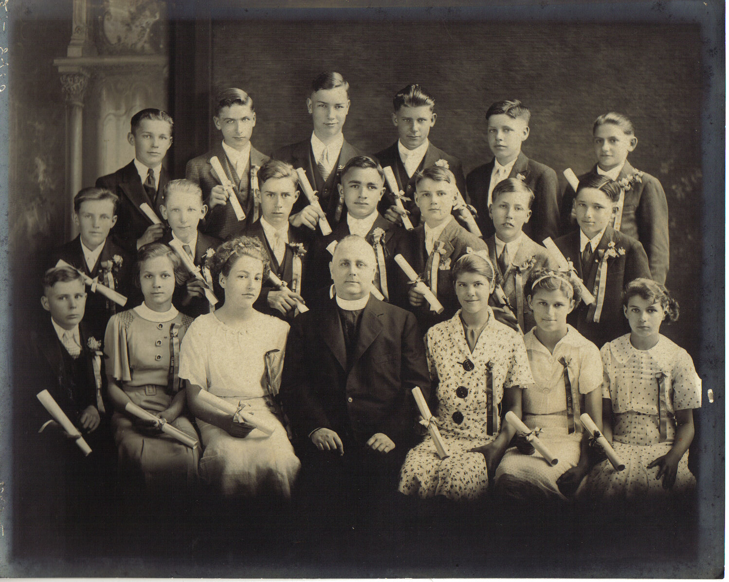 The photo is a 1935 8th grade graduation from St. Bernard's in Thorp. The following identifications were made by Ken & Peg Alger Maier with the help of Ken's sister, Marge.