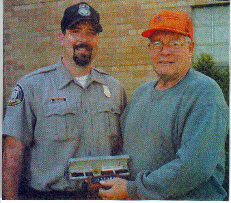 On Monday, October 30, 2006, Clark County’s Conservation Warden Paul Leezer presented Thorp’s Bernie Stuttgen, right, with recognition for his more than 25 years of service as a hunter safety instructor. Stuttgen was first certified as an instructor in 1974 and has been teaching hunter safety ever since. Leezer figured t hat in the past 25 years alone, Stuttgen has educated at least 1,011 students on the rules and responsibilities of hunting. In addition, he has taught three snowmobile courses and one boating course. “I got into this because they couldn’t find anyone else to do it,” Bernie said modestly. It was former instructor Frank Sarafin who got him started. Explained Leezer, “If we didn’t have these guys volunteering to teach these classes – not only a lot of their time, but, often using their money – we wouldn’t have any new hunters.” Bernie taught a regular eight-class course this past summer through the Thorp School District’s summer school program and more recently a special course to a group of Mennonite youngsters so that they will be able to take advantage of this year’s upcoming gun deer season. In recognition of his ongoing efforts, Bernie Stuttgen, was awarded his 25-year plaque and a special watch commemorating hunter safety. |