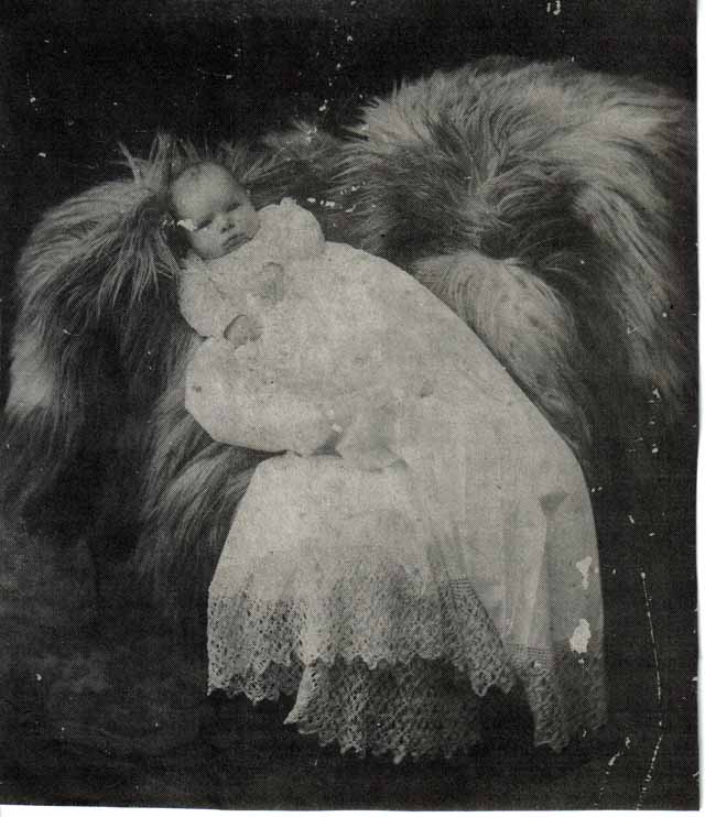 A baby in a long white dress rests on a bed of furs, draped on a chair or table staring towards the camera with all the indignation a dressed –up baby can muster.  This baby is the third in the set of T. J. Jones photos brought in by Janet Rogalski.  Do you know who is pictured here, or the occasion for the dress?  Do you know anything about T. J. Jones, or the subject of the photo set?  Please share any information you have with us, and our readers.