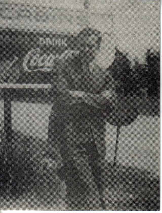 A well-dressed man stands near a sign advertising glass-bottled Coke and gasoline.  It must have been a while ago, since the price is $1 for five gallons!  Do you know where (who) this stylish man is, and where the advertisements were from?  Do you know when the picture was taken?  Please let us know, and we will pass on the information to our readers.