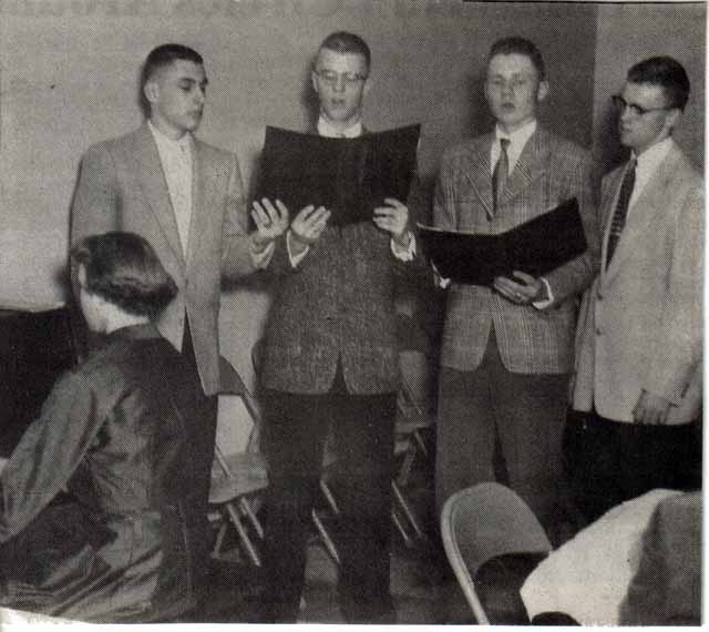 Four young men with very similar haircuts and clothing styles stand singing, while a woman plays the piano in accompaniment.  Does anyone know when or where this picture was taken?  Can you identify any of the people in the photograph?  Please let us know and we will pass on any information to our readers.