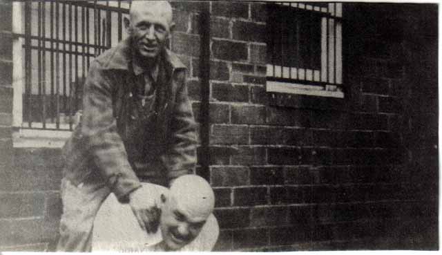 It is hard to tell whether or no the men in this week’s photo are being aggressive or just fooling around. They seem to be smiling, as they stand in front of a brick building with bars on the windows.  Do you know who these people are?  Do you know where and when this photo was taken?  Let us know and we will pass on the information to our readers.