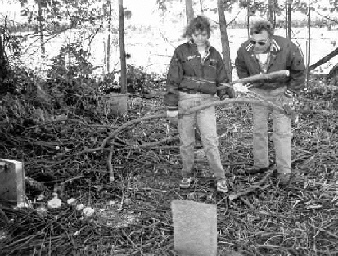 WCC worker Roxanne Tieman and Forestry and Parks Administrator Don Kirn paused from clearing the brush to read a weathered tombstone. |