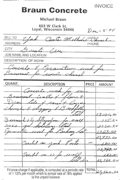 This went well as some members stepped forward and came up with $17,500. The promissory note agreement states, the York Center United Methodist Church of Granton, Wisconsin, promises to pay annual interest at the rate of 6.75%, payable on the first of April each year, first interest payment to be April 1, 1995. The York Center United Methodist Church of Granton, Wisconsin, promises payment of the principal in full on or before April 1, 2000.