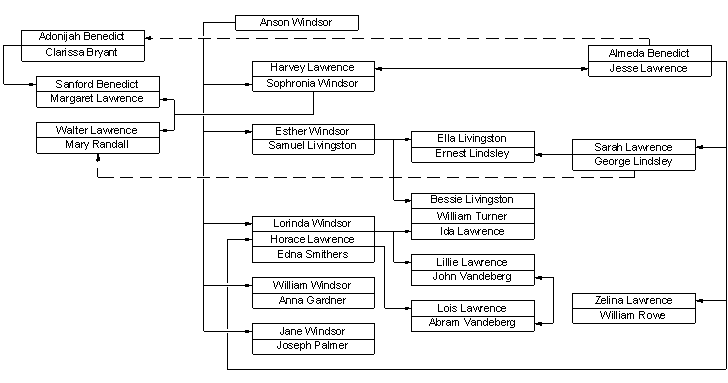 Vandeberg. Several other relatives of Jesse and Almeda Lawrence also came to York Township during that time. One of them was Almeda Lawrence's nephew, Adonijah Benedict. Adonijah and wife, Clarissa (nee Bryant) settled in York with their four sons, Sanford, Adelbert, Charles and Fred. In addition, Jesse Lawrence's sister-in-law, Sophronia (nee Windsor) Lawrence, came to York Township as a widow with her two children, Walter and Margaret Lawrence. Sophronia's husband, Harvey (Jesse Lawrence's brother), had passed away in 1863 while serving in the American Civil War. Sophronia Lawrence's son, Walter, married Mary Randall, who was a niece to George and Sarah (nee Lawrence) Lindsley. Sophronia Lawrence's daughter, Margaret, married Sanford Benedict (as mentioned earlier, the son of Almeda Lawrence's nephew, Adonijah). Sophronia herself, was re-married to another early York settler, Ed Bassett. Although they later divorced, Sophronia Lawrence was commonly known as Sophronia Bassett in her later years. Finally, another related family included Anson Windsor with four of his daughters and one son. Two of Anson Windsor's daughters were previously mentioned; one being Sophronia Lawrence, the sister-in-law to Jesse Lawrence and the other being Lorinda Lawrence, who again was Horace Lawrence's first wife. One of the other two Windsor daughters that settled in the York Township was Esther, whose husband was Samuel Livingston. One of Samuel and Esther (nee Windsor) Livingston's daughter, Ella, married Ernest Lindsley, who was a son to George and Sarah (nee Lawrence) Lindsley. Again, Sarah Lindsley was a sister to Horace Lawrence and a daughter to Jesse and Almeda (nee Benedict) Lawrence. The other Livingston daughter, Bessie, married William "Pint" Turner. Pint Turner was a son of Abel Turner, one of the earliest settlers of York Township. Pint Turner's first wife was Bessie's cousin, Ida Lawrence, who was another daughter of Horace and Lorinda (nee Windsor) Lawrence. She died in 1881 as the result of a shooting accident. The fourth Windsor daughter was Jane and she married Joseph Palmer. The Palmers were another family that settled York Township in the late 19th century. Lastly, Anson Windsor's son, William, also came to York Township and married a young woman named Anna Gardner, the daughter of Wolfurd and Elizabeth Gardner. Like the Palmers, the Gardners were another early York Township family. Compiled by Steven Lavey from Benedict / Lawrence / Windsor family records. |